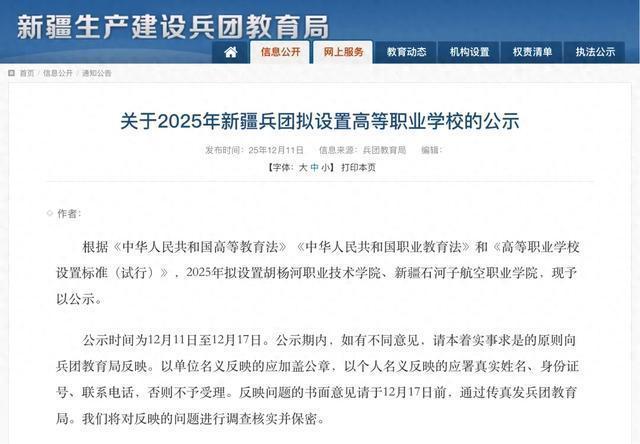 12月11日,新疆生产建设兵团教育局发布《关于2025年新疆兵团拟设置高等职业学校的公示》。